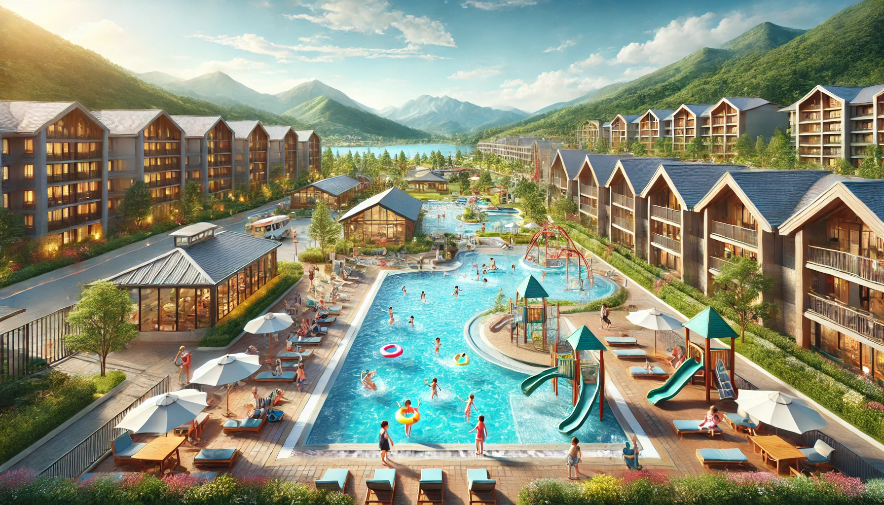 ✨ 특징: 자연 속에서 즐길 수 있는 대규모 리조트로, 4,000평 규모의 넓은 단지를 자랑해요. 아이들을 위한 인피니티 미온수 풀과 대형 온수풀, 키즈 워터파크까지 다양한 물놀이 시설이 있어요.