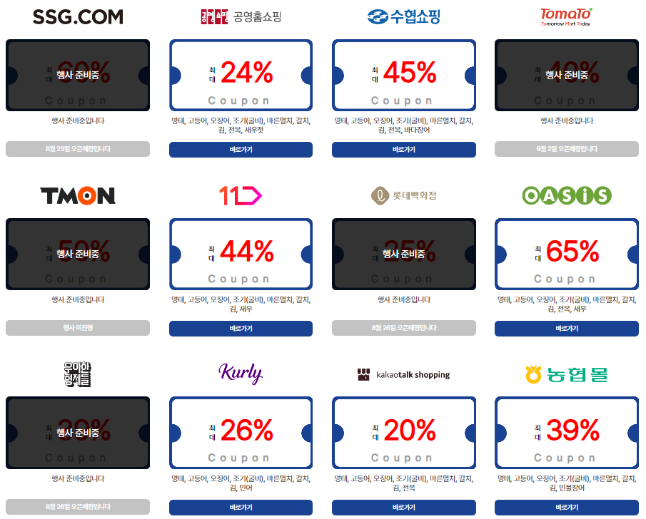 아래 링크를 통해 수산대전 쿠폰을 다운 받으실 수 있습니다.(보이는 사진보다 더 많은 업체가 참여 중 임)